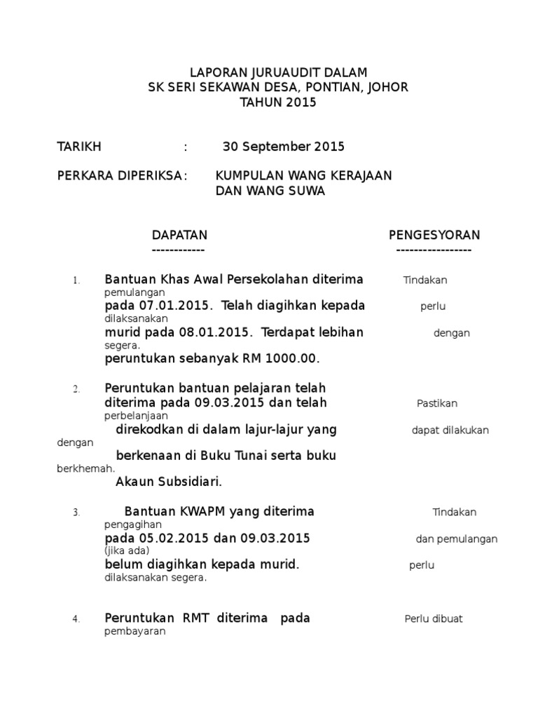 Related Posts To Contoh Laporan Audit Dalaman Kewangan Sekolah Contoh Laporan Audit Dalaman Kewangan Sekolah 2017-07-11T225400-0700 Rating. BAHAGIAN AUDIT SEKOLAH KEMENTERIAN PENDIDIKAN MALAYSIA i Salam Sejahtera Syukur kehadrat Allah SWT di atas limpah rahmat dan izinnya Bahagian Audit Sekolah terus menelusuri tahun 2019 dengan cemerlang. PK 02 Pengurusan Jadual Waktu.